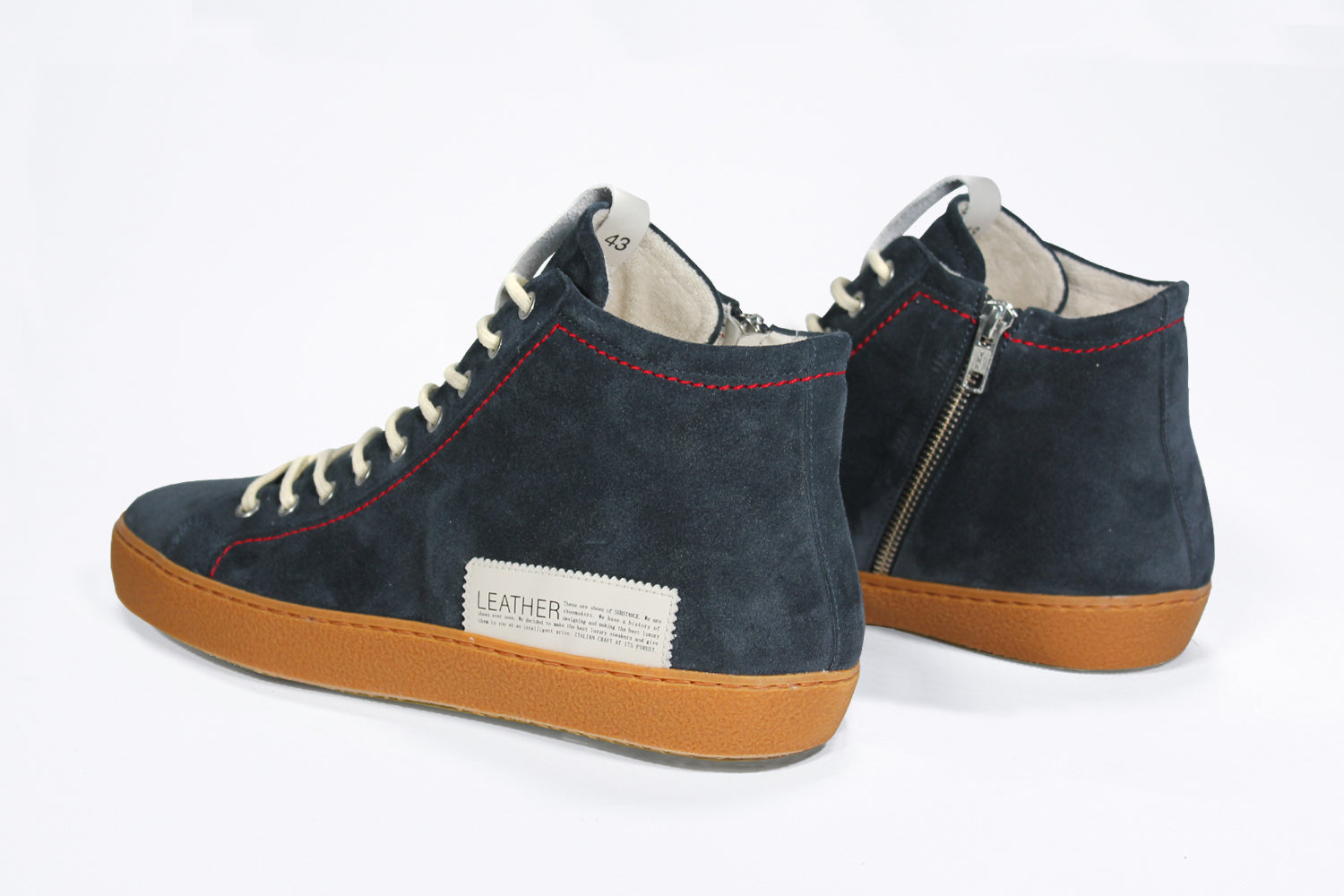 The Men's ORIGINAL LC17 High-top Navy Suede Sneaker brings understated elegance and premium Italian craftsmanship to a versatile everyday silhouette. Crafted from rich navy Italian suede and handmade in Venice, this men’s sneaker offers a soft, textured finish that stands out with subtle sophistication. The high-top design provides gentle ankle support while maintaining a clean, streamlined profile. Inside, a cushioned leather insole ensures all-day comfort, and a flexible rubber outsole delivers smooth movement and reliable grip. A soft interior lining improves breathability and wearability, while precise stitching ensures durability over time. With its deep suede tone and minimalist aesthetic, the LC17 navy high-top pairs effortlessly with denim, chinos or tailored trousers — perfect for casual, smart-casual or urban outfits.
